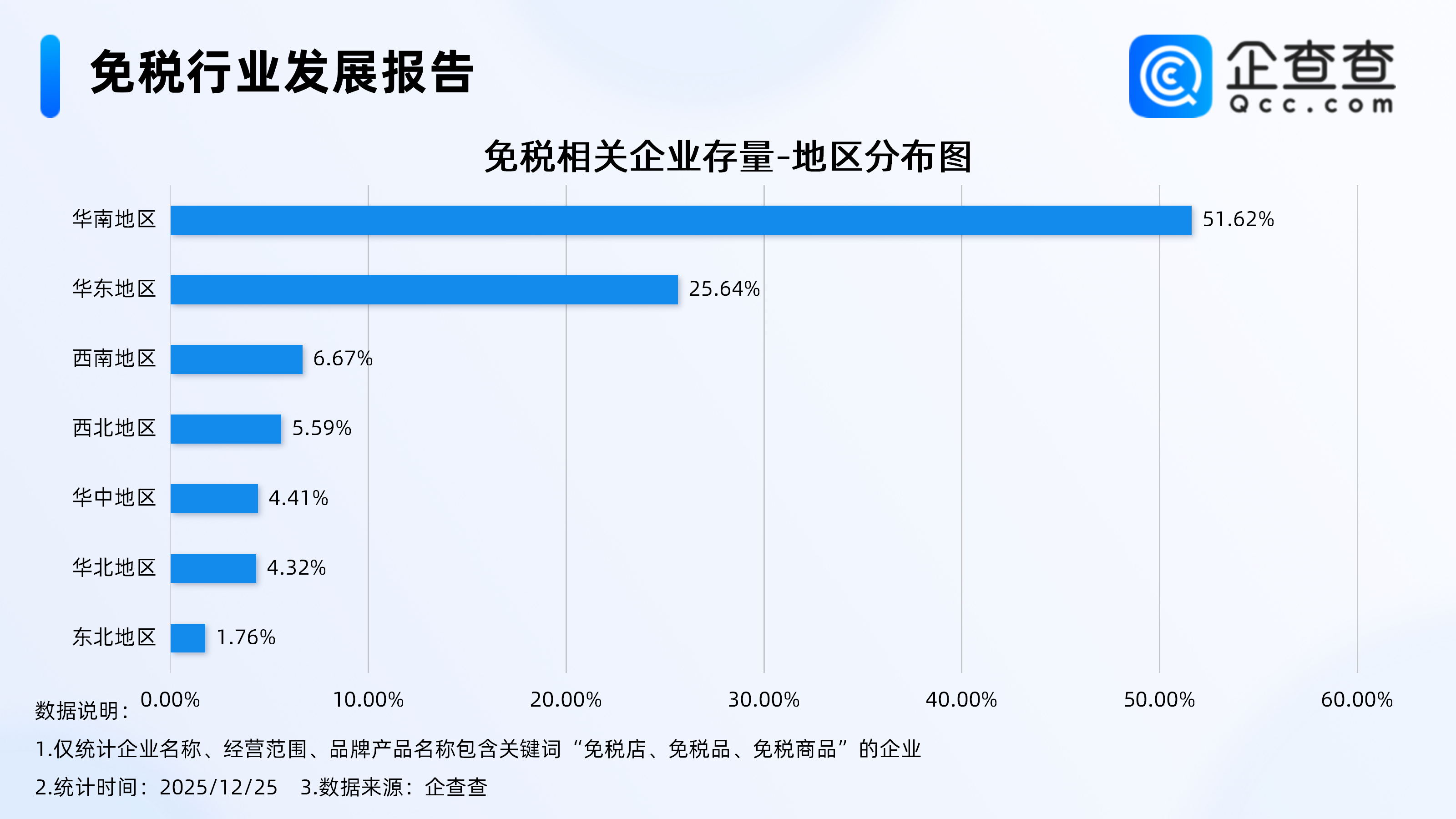 企查查数据显示,从地区分布来看,免税相关企业主要集中分布在华南地区,占比过半,达51.62%。其次,分布在华东地区的相关企业占比25.64%。其余地区占比均不足10%。