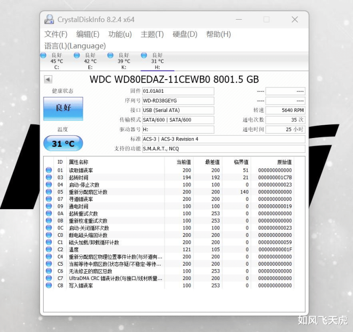8TB容量在Windows系统中显示可用容量7451.91GB,这是硬盘厂商十进制计算(1TB=1000GB)与系统二进制计算(1TB=1024GB)的正常差异,并非存储空间缩水,懂行的用户都清楚这一点。用Crystal Disk Info软件检测,硬盘型号为WDC WD80EDAZ-11CEWB0,标称8001.5GB符合硬件规格,传输模式为SATA 600。