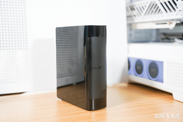 硬盘的机身设计更是戳中实用需求,立式造型高度不足170mm,像一本精装字典立在桌面,不占空间还自带专业感。通体黑色高光金属质感外壳,触感细腻,前脸中央磨砂区域能有效防反光、抗指纹,弧形边框让整体线条更柔和,正面的easystore标识和WD标志,简约又辨识度拉满。