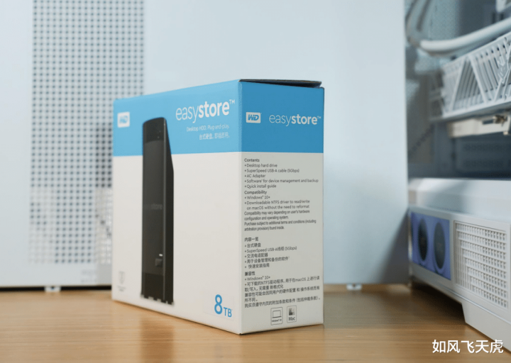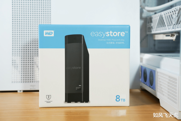 这款WD easystore™台式硬盘的外包装是清爽的蓝白色调,盒面清晰标注产品外观与容量,一眼就能看清核心信息,我入手的8TB版本,这款硬盘最大容量是22TB,目前中国大陆售卖的最大容量是12TB,可以满足不同人群的存储需求。