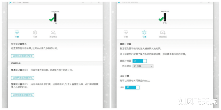 通过附送的设备管理软件,桌面驻留小图标就能一键调出操作界面,实时查看硬盘状态、快速弹出硬盘、控制LED灯开关,操作直观便捷。打开主程序还能实现更多专业功能:可对硬盘进行快速诊断、全面扫描,及时排查潜在故障;能自定义睡眠计时器,设置硬盘闲置后自动休眠的时间,有效降低功耗、延长硬盘寿命;LED灯的开关设置也能满足不同使用场景的需求,比如我有时干到深夜,就可以关闭灯光,避免干扰。