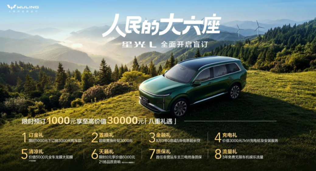 为回馈广大用户支持,五菱星光 L 正式推出限时盲订权益政策:用户通过五菱汽车 APP、小程序等官方渠道支付 1000 元订金,即可解锁至高价值 30000 元八重礼遇。礼遇涵盖订金 1000 元抵 3000 元购车款、至高 3000 元置换补贴、8 万元 3 年 0 息或 5 年低息金融方案、价值 3000 元 7kW 充电桩及安装服务、价值 5000 元全车龙膜太阳膜、260km 旗舰版专享 0 元购价值 6000 元 21 扬高品质音响、3 年免费无限车机娱乐流量、首任非营运车主三电终身质保。多重权益覆盖购车、用车、养车全周期,进一步降低家庭购车与用车成本。